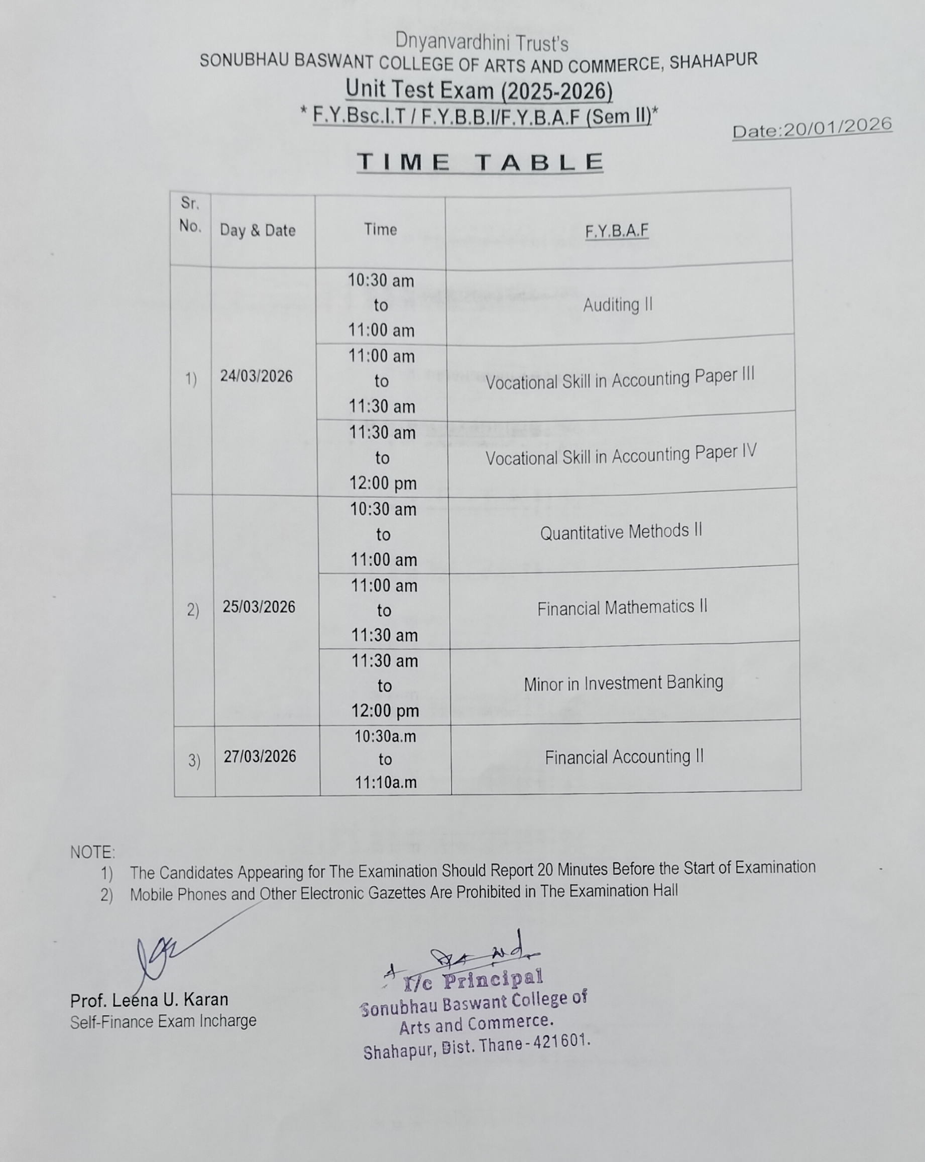 Unit Test: ADDITIONAL - FYBAF (SEM II): Time Table 2025-26NEW