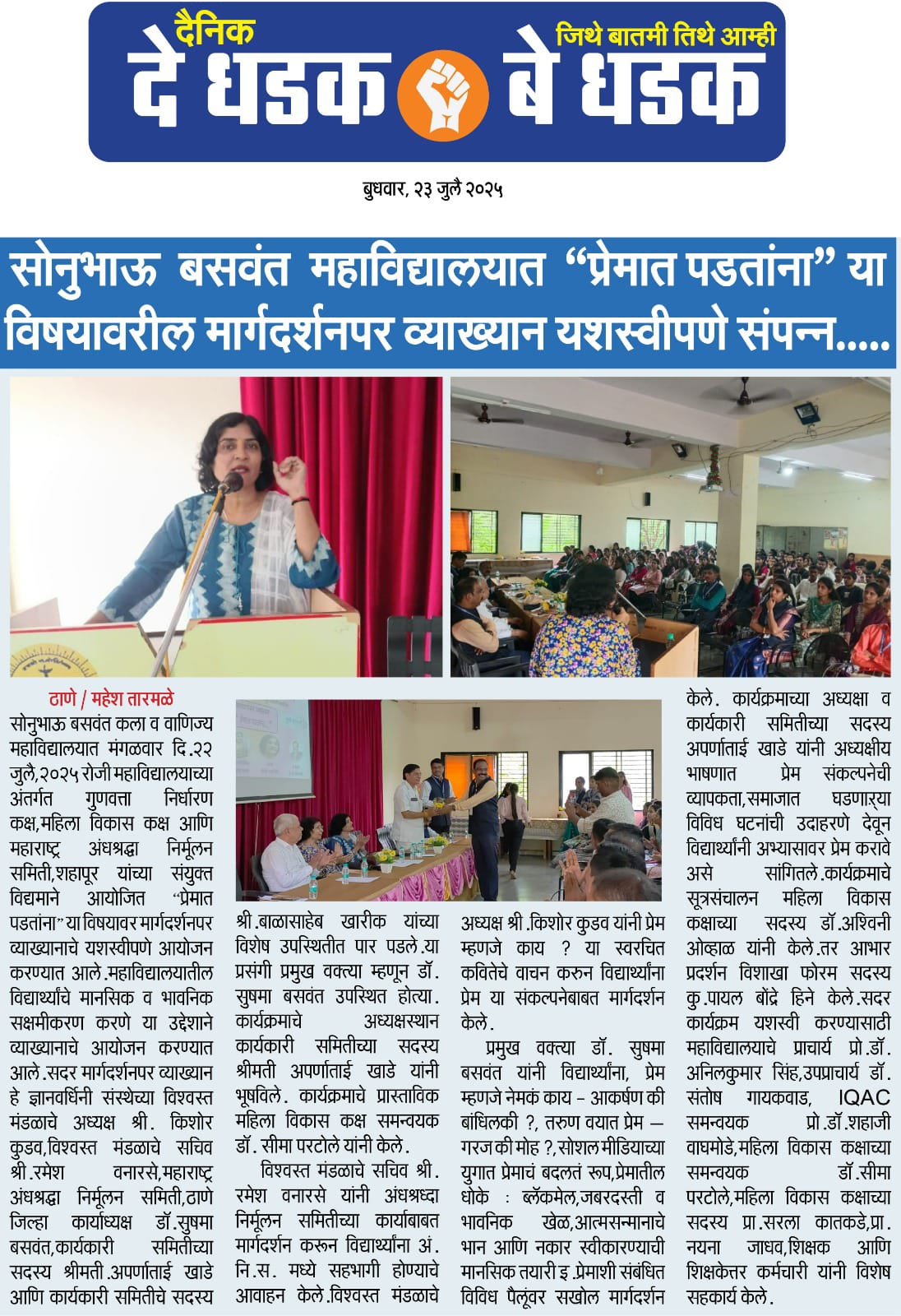 The college offers 8 academic programmes: Five at the undergraduate level (UG) - B.A., B.Com., B.Sc.I.T., B.Com with Banking & Insurance, B.Com with Accounting & Finance, and Three at the post graduate level (PG)- M.A. in Marathi, Hindi, English, History and Economics, M.Sc.I.T., and M.Com. (Advanced Accountancy).