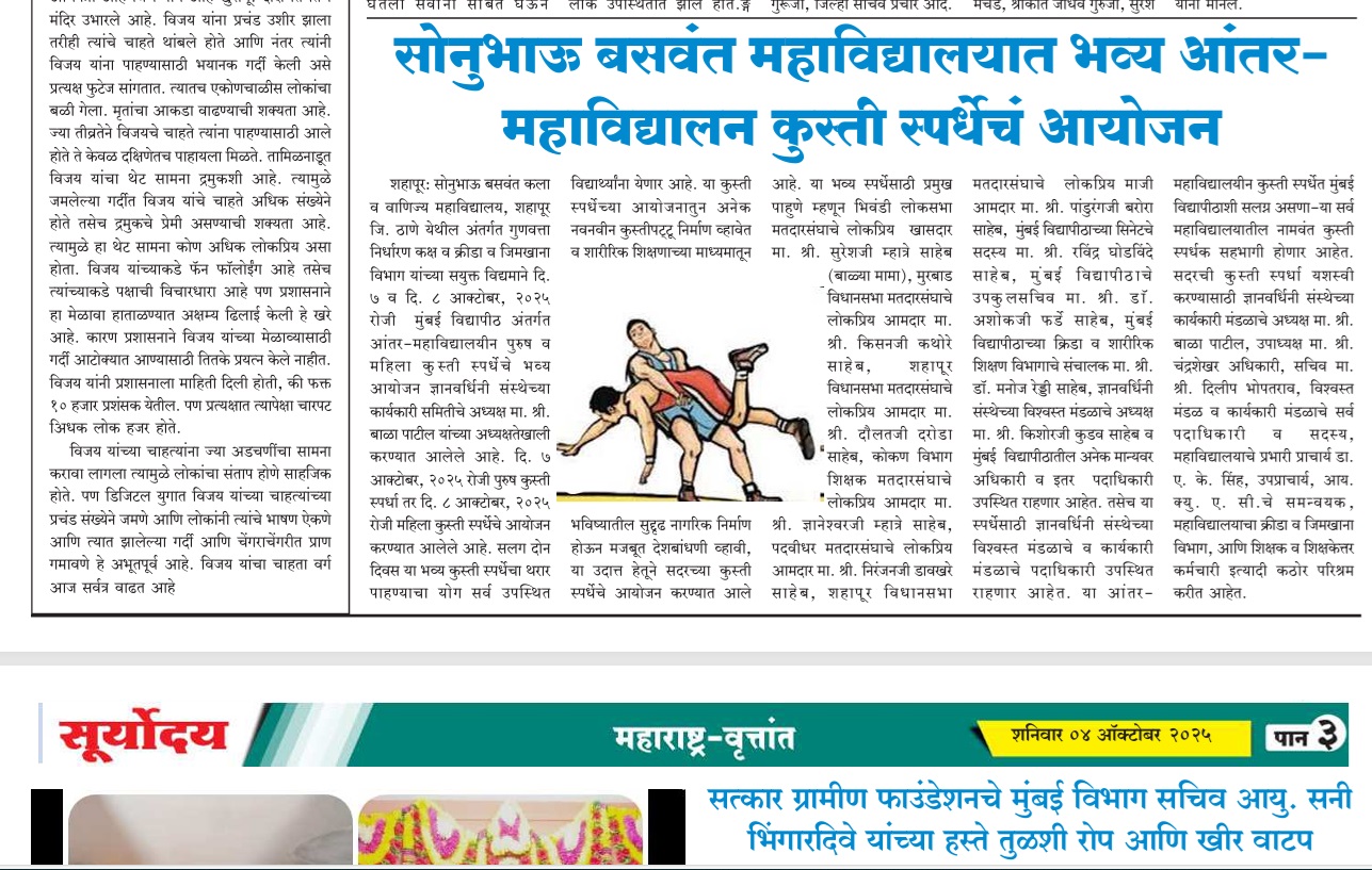 The S. B. College was founded by a private trust named as Dnyanvardhini in August 1984, to cater to the educational needs of tribal and backward communities of Shahapur taluka of Thane district of Maharashtra. The college functioned on non-grant basis from 1984 to 1988, and thereafter got its full 100 percent grant from the Maharashtra government. The college is affiliated to the University of Mumbai. It is spread over an area of 6.5 acres. Read More...