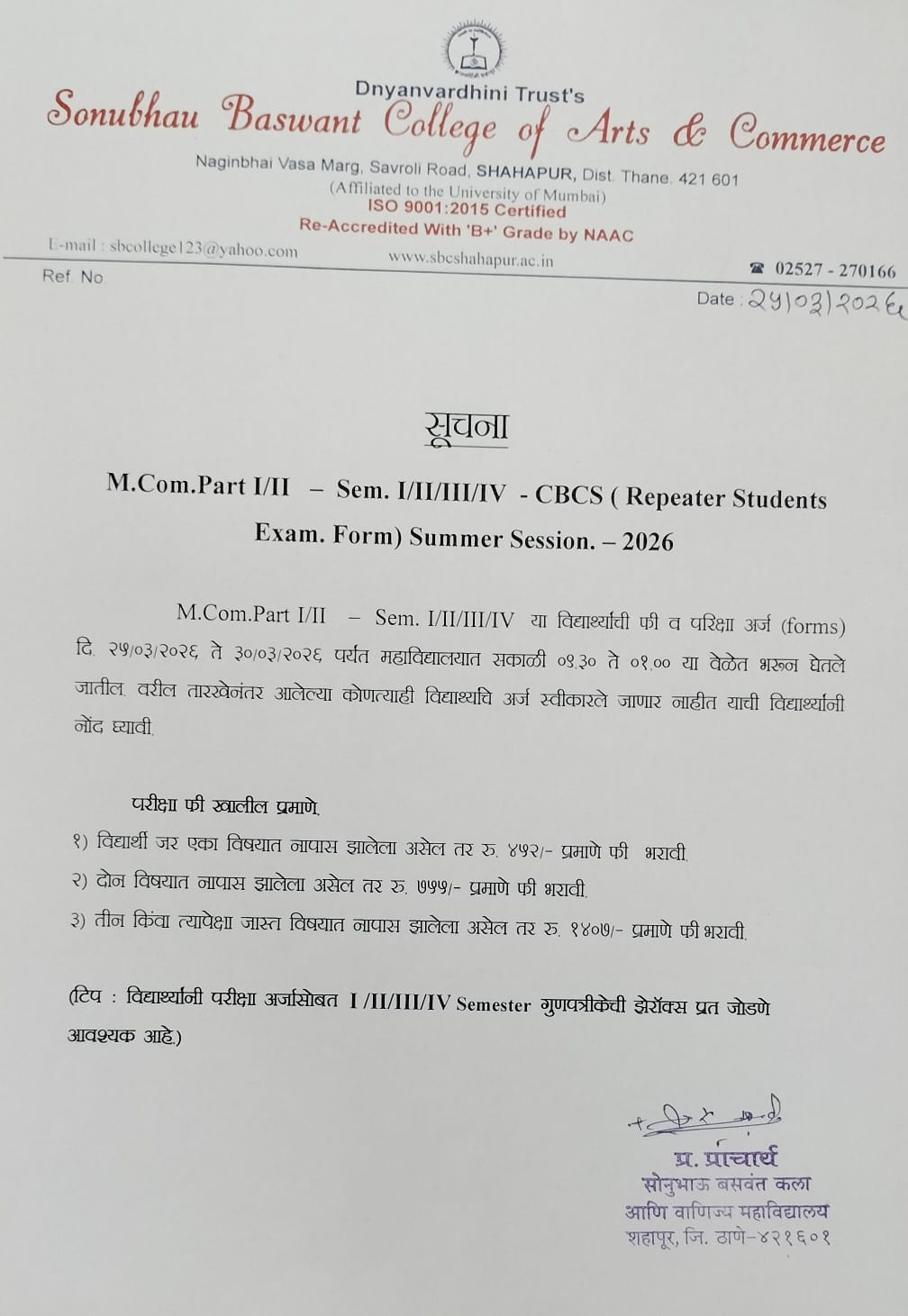 The S. B. College was founded by a private trust named as Dnyanvardhini in August 1984, to cater to the educational needs of tribal and backward communities of Shahapur taluka of Thane district of Maharashtra. The college functioned on non-grant basis from 1984 to 1988, and thereafter got its full 100 percent grant from the Maharashtra government. The college is affiliated to the University of Mumbai. It is spread over an area of 6.5 acres. Read More...